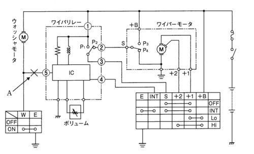 30 図に示すワイパ回路において,Aの箇所が断線した場合の作動に関して,不適切なものは次のうちどれか。 (1) ウォッシャモータが作動しない。 (2) ウォッシャ連動でワイパが作動しない。 (3) Loポジションでは,ワイパが低速で作動する。 (4) INTポジションで…