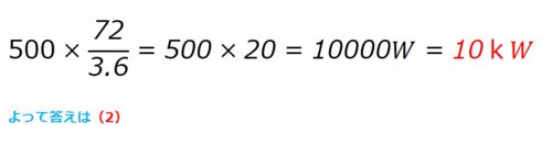 32 自動車が72km/hの一定速度で走行しているときの駆動力が500Nだった。このときの出力として,適切なものは次のうちどれか。 (1)1kW (2)10kW (3)24kW (4)36kW 解く 単位W=N・m/s